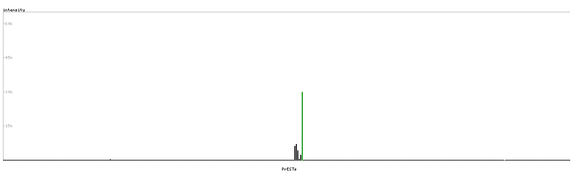 At the top of the view, the position of the antigen (identified by the corresponding HPA identifier) is shown as a green bar. A yellow triangle on the bar indicates a <100% sequence identity to the protein target.