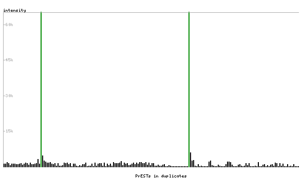 At the top of the view, the position of the antigen (identified by the corresponding HPA identifier) is shown as a green bar. A yellow triangle on the bar indicates a <100% sequence identity to the protein target.
