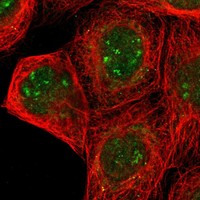 Assay for determining the subcellular location of encoded protein(s) by indirect immunofluorescence microscopy. The antibody-based staining is generally carried out in U2OS and two additional cell lines, selected based on RNA expression. Representative multi-color images showing the protein of interest in green are displayed below. The images also include markers for the nucleus (blue), microtubules (red) and ER (yellow). All images are clickable for an enlarged view. For cell structure reference, visit the cell dictionary.