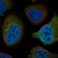 Assay for determining the subcellular location of encoded protein(s) by indirect immunofluorescence microscopy. The antibody-based staining is generally carried out in U2OS and two additional cell lines, selected based on RNA expression. Representative multi-color images showing the protein of interest in green are displayed below. The images also include markers for the nucleus (blue), microtubules (red) and ER (yellow). All images are clickable for an enlarged view. For cell structure reference, visit the cell dictionary.