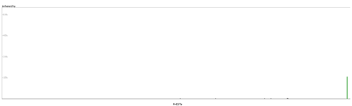 At the top of the view, the position of the antigen (identified by the corresponding HPA identifier) is shown as a green bar. A yellow triangle on the bar indicates a <100% sequence identity to the protein target.
