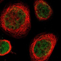 Assay for determining the subcellular location of encoded protein(s) by indirect immunofluorescence microscopy. The antibody-based staining is generally carried out in U2OS and two additional cell lines, selected based on RNA expression. Representative multi-color images showing the protein of interest in green are displayed below. The images also include markers for the nucleus (blue), microtubules (red) and ER (yellow). All images are clickable for an enlarged view. For cell structure reference, visit the cell dictionary.