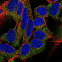 Assay for determining the subcellular location of encoded protein(s) by indirect immunofluorescence microscopy. The antibody-based staining is generally carried out in U2OS and two additional cell lines, selected based on RNA expression. Representative multi-color images showing the protein of interest in green are displayed below. The images also include markers for the nucleus (blue), microtubules (red) and ER (yellow). All images are clickable for an enlarged view. For cell structure reference, visit the cell dictionary.