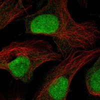 Assay for determining the subcellular location of encoded protein(s) by indirect immunofluorescence microscopy. The antibody-based staining is generally carried out in U2OS and two additional cell lines, selected based on RNA expression. Representative multi-color images showing the protein of interest in green are displayed below. The images also include markers for the nucleus (blue), microtubules (red) and ER (yellow). All images are clickable for an enlarged view. For cell structure reference, visit the cell dictionary.